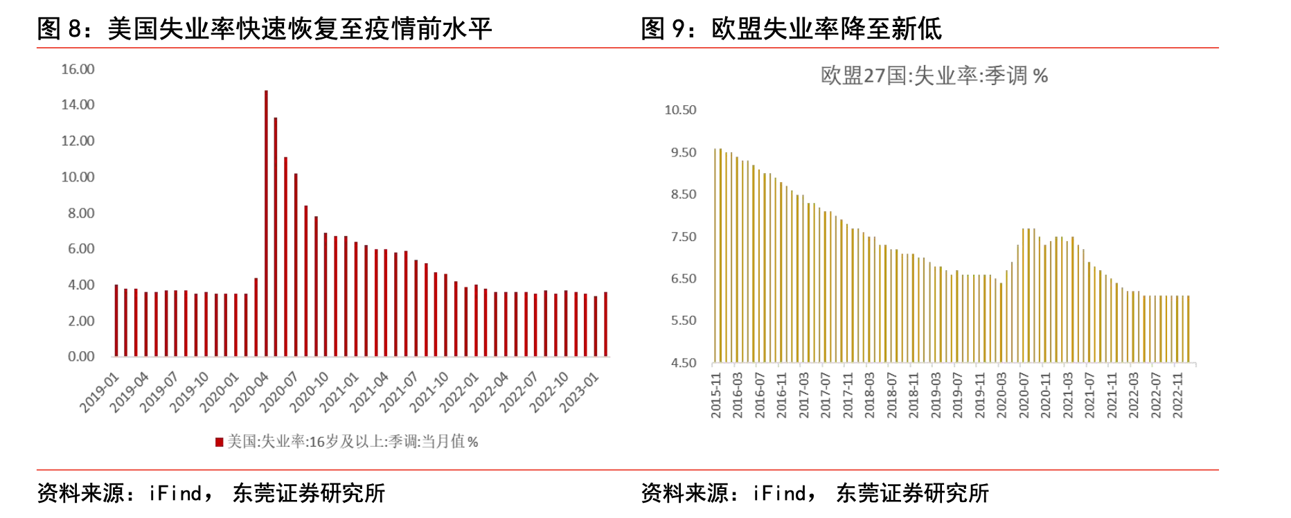 欧美取消防疫限制后失业率基本恢复至疫情前水平。自 2021 年 3 月左右美国防疫 政策大幅松动,多州宣布重新开放起,美国失业率快速下降,至 2022 年 4 月美国 正式撤销口罩令时,全美失业率已降至 3.6%,恢复至 2019 年同期水平。与美国 类似,欧盟 27 国失业率自防疫措施松动后呈下降趋势,至 2022 年底已降至新低。 整体来看,美国、欧洲防疫措施解禁较早,且受益于大力度的经济刺激手段,用 工需求已基本修复,失业率持续下降至疫情前水平。
